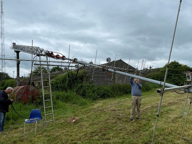 Jim G0RTD & Adam G0AUR raising an old Tomma 70cms beam for SWR checks prior to fitting on main mast (May 2024).